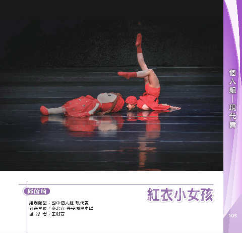 個 組 人 舞 代 現 ─ ߎВʃɾ܀ ߎВʃɾ܀ 邱茵琦 組別類型:國中個人組 現代舞 參賽單位:臺北市 長安國民中學 攝 影 者:王淑蓉 103
