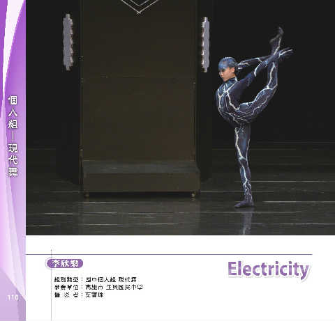 個 人 組 現 舞 代 ─ E lec tricit y Electricity 李欣樂 組別類型:國中個人組 現代舞 參賽單位:高雄市 正興國民中學 110 攝 影 者:葉寶珠
