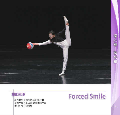 組 個 人 舞 代 現 ─ Forced Smile F or c ed Smile 丁苡庭 組別類型:國中個人組 現代舞 參賽單位:臺南市 新東國民中學 攝 影 者:陳柏殷 111