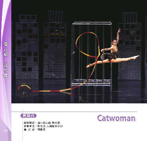 人 個 組 舞 代 現 ─ C a t w oman Catwoman 黃凱貞 組別類型:國小個人組 現代舞 參賽單位:彰化縣 大湖國民小學 132 攝 影 者:穆佩芬