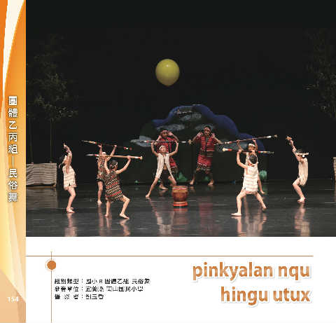 體 團 乙 組 丙 舞 俗 民 ─ pink y alan nqu pinkyalan nqu 組別類型:國小 B 團體乙組 民俗舞 hingu utux 參賽單位:宜蘭縣 南山國民小學 hingu utux 154 攝 影 者:劉玉香