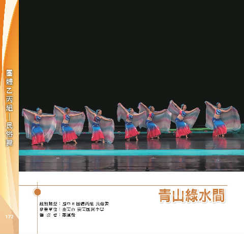 乙 體 組 丙 團 民 俗 舞 ─ ڡʆၠ˥ග ڡʆၠ˥ග 組別類型:國中 B 團體丙組 民俗舞 參賽單位:臺南市 安南國民中學 172 攝 影 者:鄒運發