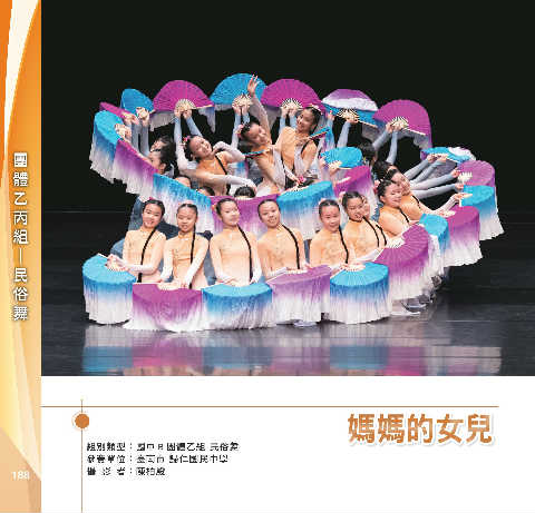 體 乙 組 丙 團 舞 俗 民 ─ ٙɾՅ ٙɾՅ 組別類型:國中 B 團體乙組 民俗舞 參賽單位:臺南市 歸仁國民中學 188 攝 影 者:陳柏殷