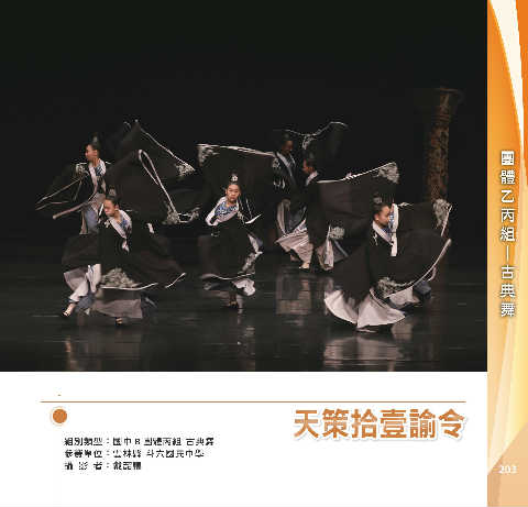 丙 組 團 體 乙 舞 典 古 ─ ˂ഄܽఠፙ˿ ˂ഄܽఠፙ˿ 組別類型:國中 B 團體丙組 古典舞 參賽單位:雲林縣 斗六國民中學 攝 影 者:戴韶鵬 203