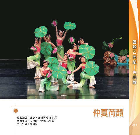 丙 組 團 體 乙 舞 典 古 ─ ࢀஃᗲ ࢀஃᗲ 組別類型:國小 B 團體丙組 古典舞 參賽單位:南投縣 漳興國民小學 攝 影 者:鄒運發 213