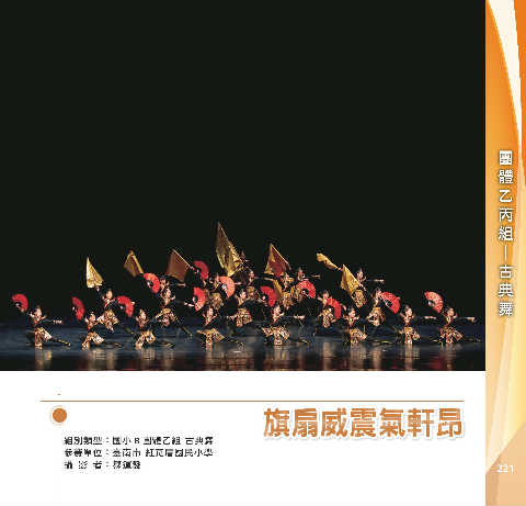 丙 組 團 體 乙 舞 典 古 ─ ࣂ۾ቤं ࣂ۾ቤं 組別類型:國小 B 團體乙組 古典舞 參賽單位:臺南市 紅瓦厝國民小學 攝 影 者:鄒運發 221