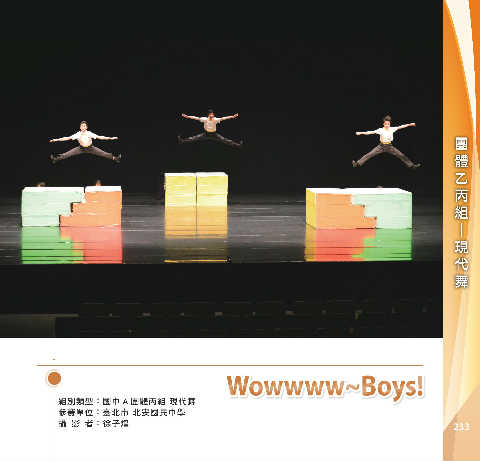丙 組 團 體 乙 舞 代 現 ─ Wowwww~Boys! W o w w w w~B o y s! 組別類型:國中 A 團體丙組 現代舞 參賽單位:臺北市 北安國民中學 攝 影 者:徐子煌 233