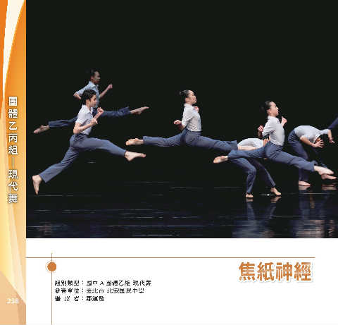 體 乙 組 丙 團 舞 代 現 ─ ೊॷग़ ೊॷग़ 組別類型:國中 A 團體乙組 現代舞 參賽單位:臺北市 北安國民中學 238 攝 影 者:鄒運發