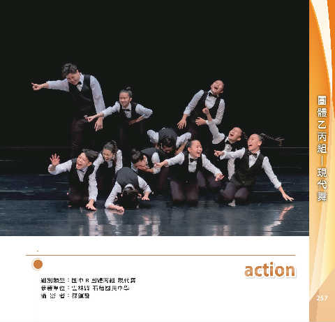 丙 組 團 體 乙 舞 代 現 ─ tion ac action 組別類型:國中 B 團體丙組 現代舞 參賽單位:雲林縣 石榴國民中學 攝 影 者:鄒運發 257