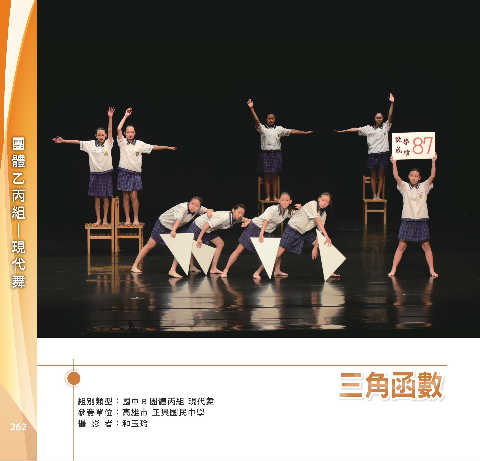 體 乙 組 丙 團 舞 代 現 ─ ɧԉՌᅰ ɧԉՌᅰ 組別類型:國中 B 團體丙組 現代舞 參賽單位:高雄市 正興國民中學 262 攝 影 者:和玉玲