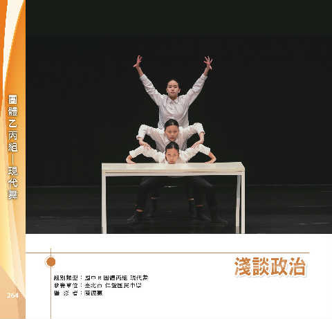 體 乙 組 丙 團 舞 代 現 ─ ሔ݁ط ሔ݁ط 組別類型:國中 B 團體丙組 現代舞 參賽單位:臺北市 仁愛國民中學 264 攝 影 者:陳德惠