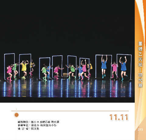 丙 組 團 體 乙 舞 代 現 ─ 11.11 11.11 組別類型:國小 B 團體乙組 現代舞 參賽單位:新北市 裕民國民小學 攝 影 者:陳文豹 273