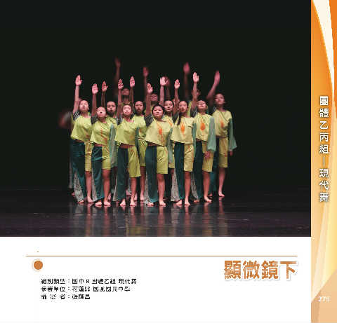 丙 組 團 體 乙 舞 代 現 ─ ᜑฆᗝɨ ᜑฆᗝɨ 組別類型:國中 B 團體乙組 現代舞 參賽單位:花蓮縣 國風國民中學 攝 影 者:張隆昌 275
