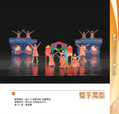 丙 組 團 體 乙 舞 蹈 兒 童 ─ ᕐ˓ຬঐ ᕐ˓ຬঐ 組別類型:國小 B 團體丙組 兒童舞蹈 參賽單位:彰化縣 和美國民小學 攝 影 者:劉超奇 281