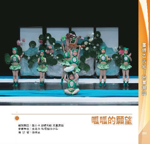 丙 組 團 體 乙 舞 蹈 兒 童 ─ կկٙᗴૐ կկٙᗴૐ 組別類型:國小 B 團體丙組 兒童舞蹈 參賽單位:臺北市 明德國民小學 攝 影 者:張美鳳 285