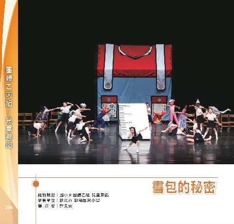 體 乙 組 丙 團 舞 兒 童 蹈 ─ ࣣ̍ٙ। ࣣ̍ٙ। 組別類型:國小 B 團體乙組 兒童舞蹈 參賽單位:新北市 新埔國民小學 286 攝 影 者:許見安