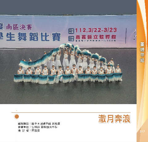 甲 組 團 體 ယ˜ֆई ယ˜ֆई 組別類型:國中 B 團體甲組 民俗舞 參賽單位:雲林縣 莿桐國民中學 攝 影 者:蔡進強 317