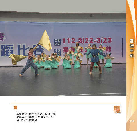 甲 組 團 體 ᐦ ᐦ 組別類型:國小 B 團體甲組 現代舞 參賽單位:嘉義縣 竹崎國民小學 攝 影 者:蔡進強 319