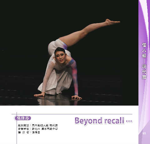 個 組 人 舞 代 現 ─ Beyond recall ··· B e y ond r ec all ··· 吳佳芬 組別類型:高中職個人組 現代舞 參賽單位:新北市 清水高級中學 攝 影 者:張隆昌 95